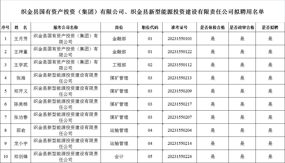 根據(jù)《織金縣國有資產(chǎn)投資(集團)有限公司、織金縣新型能源投資建設有限責任公司2023年面向社會公開招聘工作人員公告》,經(jīng)過報名、筆試、面試、資格審查、體檢、政審等程序,現(xiàn)對擬聘用人(名單見附件1)予以公示。